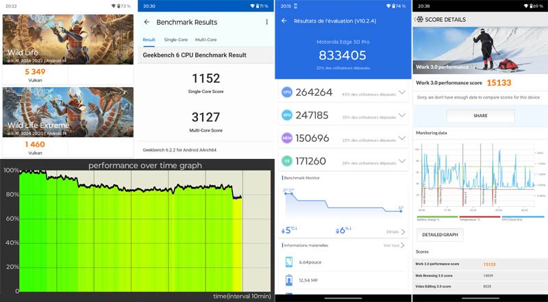 Le smartphone Motorola edge 50 Pro est équipé d’un processeur Qualcomm Snapdragon 7 Gen 3 qui propose, à l’usage une expérience qui n’a absolument rien de décevante même s’il ne s’agit pas d’un chipset haut de gamme. Il est associé à 12 Go de mémoire vive sur notre modèle de test. Si cela ne vous suffit pas, il est possible d’ajouter 4, 6, 8 et jusque 12 Go supplémentaires venant puiser dans la capacité de stockage de l’appareil, si disponible. Pour que les applications se lancent plus rapidement, on peut activer la fonction Lancement d’application intelligent qui apprend vos habitudes et précharge celles que vous utilisez le plus souvent pour un accès instantané.