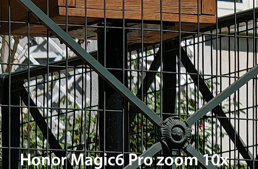 Enfin, concernant le zoom, il a le mérite d’exister, mais reste bien loin des prouesses réalisées par le téléobjectif du Honor Magic6 Pro (l’une des références en matière de photos) lorsqu’on y regarde de plus près et comme le montrent les images ci-dessous. Certes, il s’agit du niveau 10x, mais nous nous attendions à mieux. Il faut donc se limiter à 3x pour ne pas avoir de gros pâtés sur l’image du moins sur l’écran d’un ordinateur. L’ensemble manque effectivement de piqué et de précision dès qu’on va au-delà avec un lissage important des détails des objets.