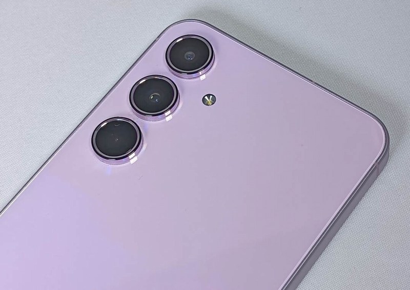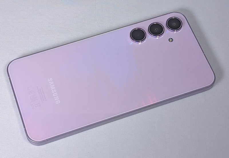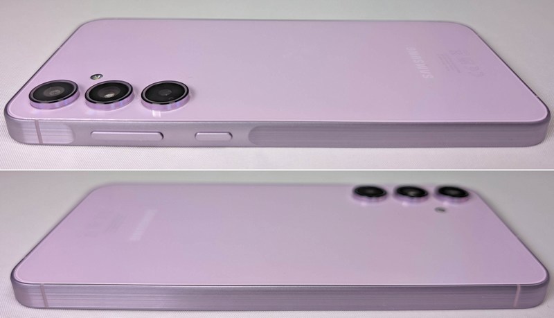Le smartphone Samsung Galaxy A55 5G propose exactement le même design que le Galaxy A35 5G qui est sorti au même moment. Côté à côté, impossible de les distinguer l’un de l’autre. Il utilise ainsi un style très épuré avec un dos totalement plat et des capteurs photo qui semblent juste posés sur la plaque arrière, au risque que la poussière s’accumule un peu entre les objectifs. Le flash est sur le même plan que le reste du dos. Il est décliné en plusieurs coloris : bleu clair, bleu nuit, lilas et lime (jaune citron). La partie arrière laisse beaucoup d’empreintes de doigt. Sur le profil droit, on retrouve la même zones légèrement bombée au niveau des boutons de mise en veille et de gestion du volume. Notez que si le châssis du Galaxy A35 5G est en plastique, celui du Galaxy A55 5G est en métal. On peut effectivement voir les antennes sur tout le pourtour.