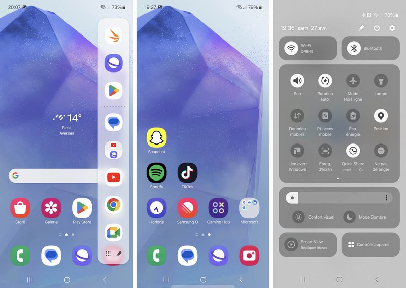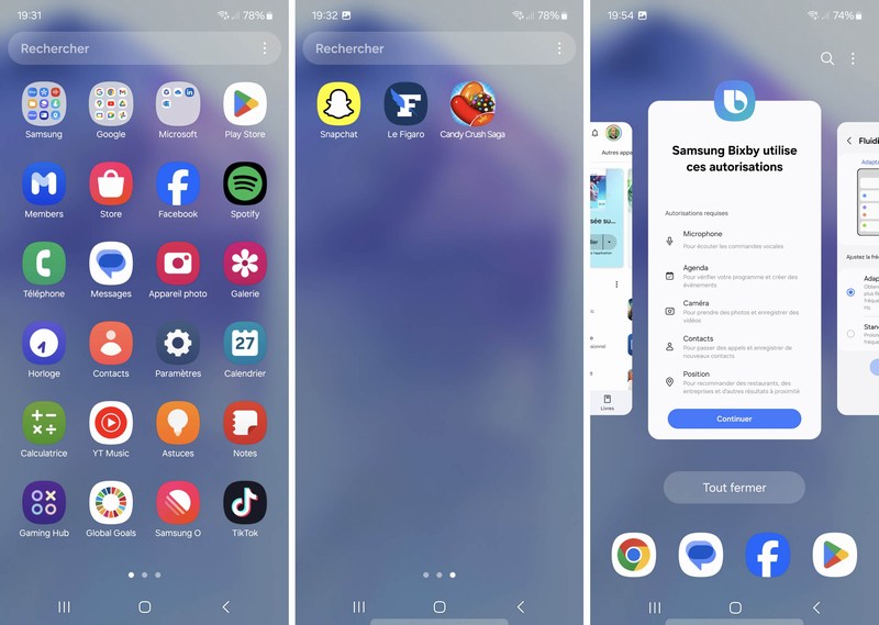 Comme sur les autres mobiles de la marque, plusieurs applications sont préinstallées dont celles de Samsung (assez nombreuses), mais aussi de Microsoft (Office365, OneDrive, LinkedIn et Outlook). Bien entendu, il y a les applications de Google. Parmi les applications tierces, lors de la première configuration, le système en propose plusieurs. Toutefois, même si on les refuse toutes, on se retrouve avec Temu, TikTok, Facebook, Spotify, Le Figaro, Snapchat et Candy Crush Saga.
