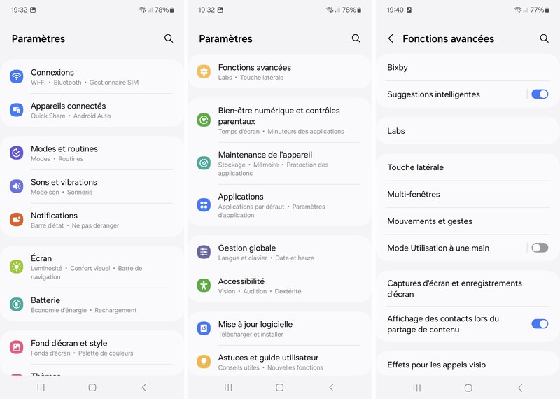 Les paramètres sont bien organisés et très nombreux permettant de gérer le mobile. Comme les autres mobiles de la marque, il y a une fonction « Maintenance » qui permet de bloquer l’accès aux données de l’appareil pendant la réparation de l’appareil. C’est très bien pensé.