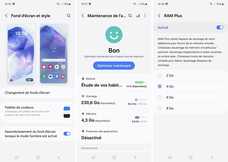 Si les performances ne sont pas satisfaisantes pour vous, sachez qu’il est possible, via le menu RAM Plus, d’ajouter 2, 4 ou 6 Go de mémoire vive virtuelle supplémentaires, le cas échéant. Le mobile testé nous a paru performant. En effet, il offre une expérience agréable avec une bonne fluidité dans les menus et sert des lancements d’applications plutôt rapides. Nous n’avons pas constaté de ralentissement. L’appareil est tout à fait apte pour les jeux vidéo avec un certain niveau de détails et une jouabilité relativement agréable et satisfaisante. Notez que le chipset est capable de proposer des performances intéressantes de manière stable pour des tests longs, ce qui est loin d’être toujours le cas.
