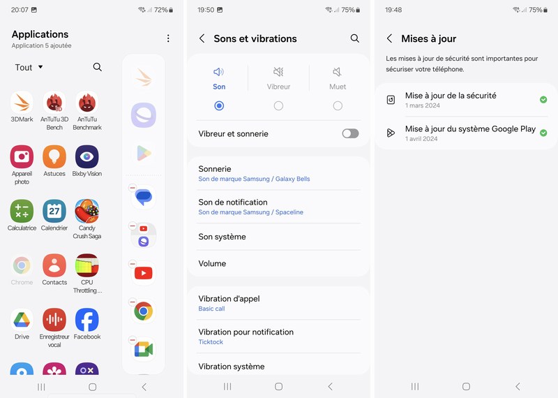 Le Galaxy A55 5G partage exactement le même système que le Galaxy A35 5G. Il est donc animé par Android 14 avec une surcouche One UI 6.1 développée par Samsung. Les personnes habituées aux mobiles de la marque sud-coréenne ne seront donc pas dépaysées. Les versions des mises à jour du système Google Play et de la sécurité dataient du 1er avril 2024, ce qui est très récent pour des tests réalisés courant avril/mai. Pour lui, Samsung promet 4 ans de mises à jour Android et 5 ans de mises à jour de sécurité. Cela laisse largement de quoi voir venir.