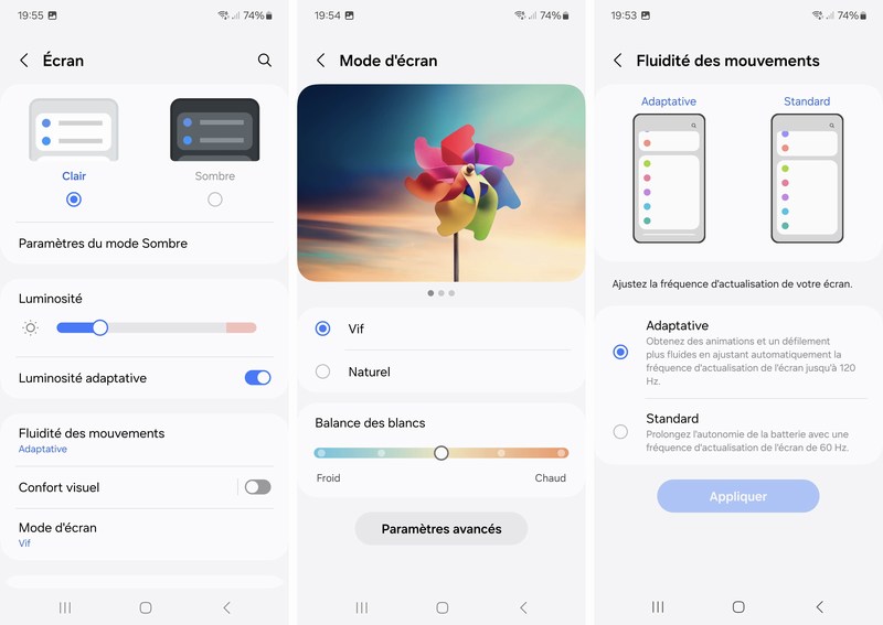 Officiellement, l’écran du Galaxy A55 5G est identique à celui du Galaxy A35 5G. Il s’agit d’une dalle AMOLED de 6,6 pouces avec une définition de 1080x2340 pixels qui supporte le format HDR10+. Les deux appareils proposent une luminosité maximale de 1000 cd/m² et offrent les mêmes options de configuration. Pourtant, mis côte à côte, nous avons remarqué que l’écran du Galaxy A55 5G paraissait très légèrement plus clair. Pourtant, nous avons appliqué les mêmes réglages. Dans les paramètres, on peut choisir entre le mode d’affichage Vif ou Naturel. Dans le premier cas, on peut moduler la température des couleurs pour obtenir une teinte plus ou moins chaude. Le mode Naturel offre un affichage très satisfaisant, proposant des couleurs naturelles et agréables à l’œil. Il est possible d’activer la fonction de protection contre les appuis accidentels et d’augmenter la sensibilité tactile. La fréquence maximale est de 120 Hz permettant d’obtenir des défilements fluides pour consulter les pages des sites Internet et les murs des réseaux sociaux.