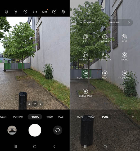 L’application Appareil photo présente une interface très classique. Il y a plusieurs options immédiatement disponibles tout en haut de l’écran. Dessous, il y a la zone de cadrage, les niveaux de zooms (0,5x, 1x et 2x) immédiatement accessibles puis les modes de prises de vue (Amusant, Portrait, Photo, Vidéo et Plus). Le menu Plus permet d’accéder à d’autres modes : Pro, Vidéo Pro, Nuit, Nourriture, Panorama, Macro, Super Ralenti, Ralenti, Hyperlapse et Single Take. Il est toujours possible de personnaliser l’interface avec des modes préférés.