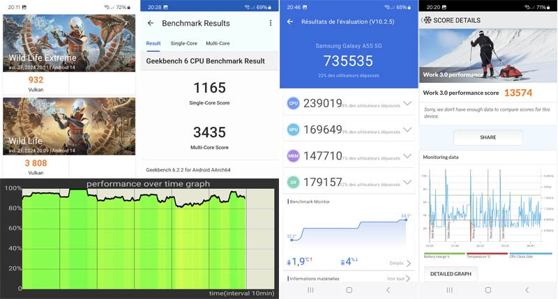 Pour fonctionner, le Galaxy A55 5G est doté du processeur Samsung Exynos 1480 contre l’Exynos 1380 au cœur du Galaxy A35 5G. Avec ce chipset, il dépasse légèrement son petit frère et la concurrence. Le téléphone embarque 8 Go de mémoire vive et deux configurations sont proposées : 128 ou 256 Go d’espace de stockage que l’on peut étendre grâce à l’introduction d’une carte mémoire au format micro SD. C’est la deuxième version que nous avons pu tester.