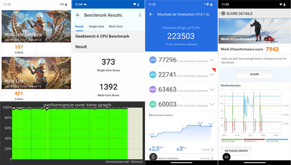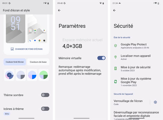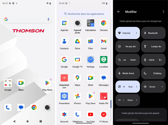 Le Thomson Origin 679 Pro est animé par Android 13. Il bénéficie d’une très légère surcouche développée par la marque qui présente notamment les icônes sous un format carré. L’interface est personnalisable et semblable à celle des mobiles Google Pixel. Il y a donc seulement les applications du géant américain. Aucune application Thomson, pas même un lien vers le site de la marque, ce qui est très rare et symbole d’une rupture avec l’interface proposée par les mobiles Xiaomi, par exemple qui sont empreints de très nombreuses applications préinstallées et autres publicités jaillissantes. On apprécie la démarche de Thomson, sur ce point. Le revers de la médaille est l’absence de fonctionnalités spéciales comme on peut en trouver sur les mobiles Samsung ou chez Honor, par exemple. La navigation possible par geste est bien entendu possible.