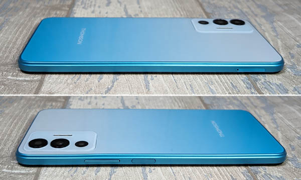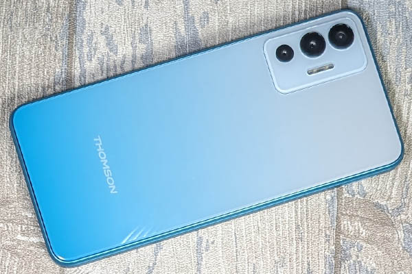 Le smartphone Thomson Origin 679 Pro profite d’un design assez intéressant et plutôt réussi, selon nous. Il s’agit d’un grand modèle qui est léger en main (malgré ses 198 grammes officiels) et bénéficie d’un très bon équilibre, en main. Il fait 8,95 mm avec une hauteur de 171,2x78 mm, ce qui est relativement large. Son châssis est en plastique. On peut le comparer au Samsung Galaxy A14 4G qui a à peu près les mêmes proportions bien qu’il soit très légèrement plus épais et plus lourd. Le modèle prêté par la marque ne souffrait d’aucun défaut notable avec une bonne qualité de fabrication. Le téléphone est décliné en noir ou en bleu/blanc. C’est ce dernier que nous avons pu tester. Son dos présente un dégradé doux entre le bleu clair en bas vers le blanc. L’effet est très agréable à l’œil.