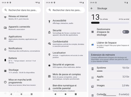 Le téléphone propose 64 Go de mémoire de stockage dont 13 Go sont utilisés par défaut par le système et les applications. Il en reste donc réellement 49 Go. La possibilité d’ajouter une carte mémoire est un plus non négligeable surtout si on utilise pas les services de stockage en ligne.