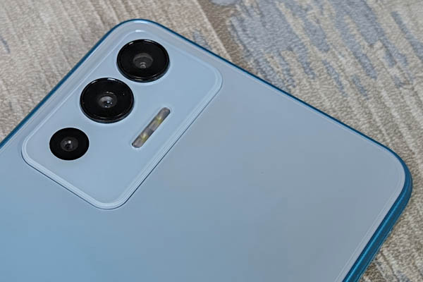Dans le coin supérieur gauche, une plaque qui dépasse à peine du reste du dos est là pour accueillir les capteurs photo. Ceux-ci sont alignés verticalement. Le double flash est positionné juste à côté.