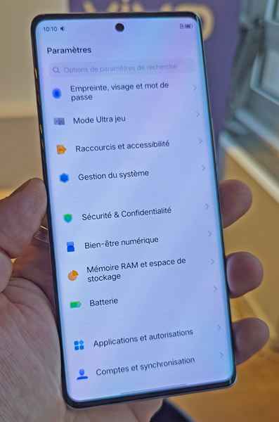 L’autre caractéristique est le fait que l’empreinte de votre doigt est enregistrée après une seule pression dans les paramètres. Tous les autres capteurs du marché demandent à poser votre doigt plusieurs fois pour qu’il enregistre plusieurs positions possibles. Avec l’Iqoo 8 Pro, posez le doigt et l’opération d’enregistrement est terminée. Passez à un autre doigt ou à tout autre chose. Rappelons que le capteur est de type ultrasonique 3D, donc plus rapide qu’un modèle classique. Vivo annonce un temps de déverrouillage de seulement 0,2 seconde.