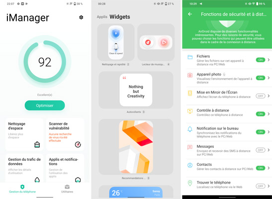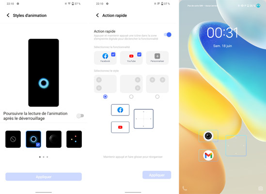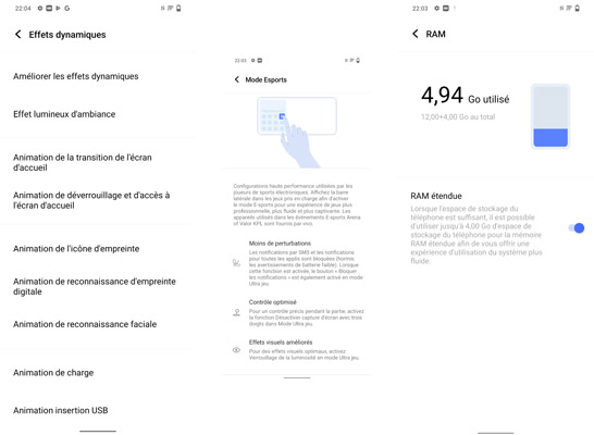Un mode Ultra Jeu est disponible dans les paramètres pour configurer le mobile lors des sessions de jeu afin de ne pas être dérangé, le cas échéant ou appliquer différents effets sonores, mais également visuels avec des optimisations selon si on préfère la rapidité ou la qualité d’affichage. Vu que l’écran est grand, un mode une main est disponible. Plusieurs animations et effets sont applicables pour les transitions des écrans principaux, de déverrouillage, de l’icône d’empreinte digitale, de la reconnaissance faciale, de charge, etc. Une barre latérale peut être ouverte pour accéder plus rapidement à certaines fonctions et des applications préalablement choisies.