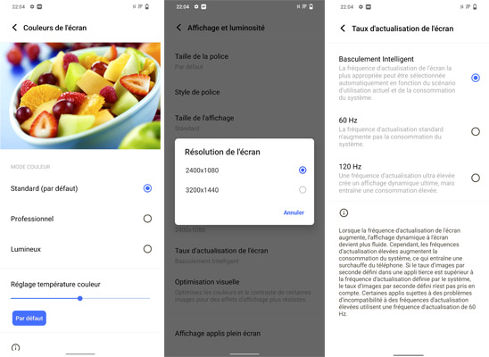 Notez la fréquence d’échantillonnage de 300 Hz ce qui est correct et permet d’offrir une bonne réactivité dans les jeux vidéo. Le rendu de l’écran est vraiment excellent et le plus bel affichage est obtenu avec le mode professionnel, mais qui se montre finalement légèrement moins lumineux que les deux autres, suffisant toutefois pour un usage en extérieur. Il y a un poinçon, en haut, au centre pour le capteur photo frontal.