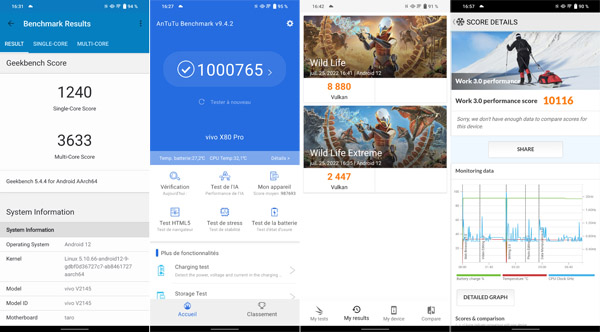 Étant un modèle haut de gamme, le Vivo X80 Pro n’avait pas d’autre choix que d’embarquer une puce Qualcomm Snapdragon 8 Gen 1 en son sein pour faire fonctionner de concert tous les composants et offrir les meilleures performances possibles. Il y a 12 Go de mémoire vive associée, mais il est possible d’ajouter 4 Go de RAM supplémentaires virtuels depuis le menu RAM dans les paramètres, si besoin. Ils sont ajoutés par défaut. Avec une telle configuration, les performances sont effectivement au rendez-vous et les scores des outils de mesure le prouvent en affichant de très hauts scores. Par contre, malgré le fait qu’il y ait un système de refroidissement intégré, nous avons trouvé que le mobile chauffait lorsqu’il était soumis à rude épreuve ce qui n’est jamais très bon, car dans ce cas, les applications peuvent refuser de se lancer ou limiter la puissance maximale en vue de préserver les composants. Dans les jeux, la surchauffe se ressent moins. Voici les principaux résultats des mesures de performances brutes (à froid).