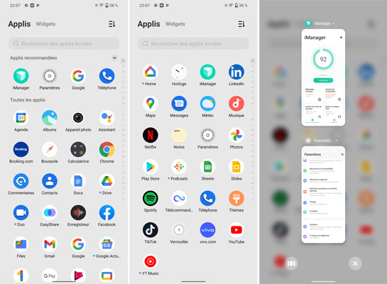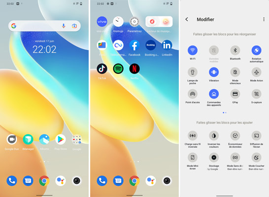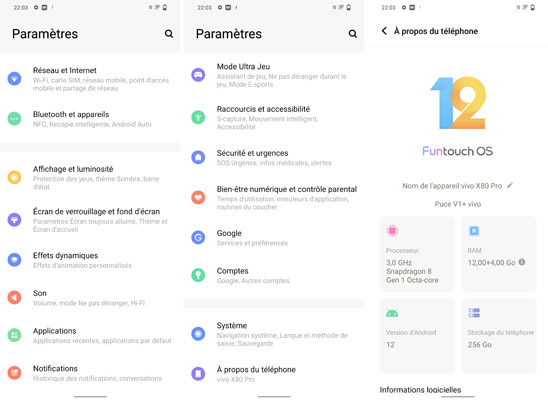Le smartphone Vivo X80 Pro est animé par le système Android 12 avec une surcouche logicielle FuntouchOS 12. La mise à jour de sécurité ainsi que celle du Google Play dataient du 1er juin 2022 pour un test réalisé courant juillet, ce qui est assez récent. Les options de personnalisation sont plutôt nombreuses sur cette interface. Il y a deux écrans d’accueil principaux et les applications sont disponibles depuis le tiroir en partant du bas de l’écran avec une navigation par gestes. L’interface Google Discovery est disponible sur le côté gauche de la page principale et de très nombreuses fonctions raccourcies ainsi que les notifications sont disponibles en effectuant un balayage depuis le bord supérieur de l’écran. Les applications en cours d’exécution peuvent s’afficher à l’horizontale ou à la verticale avec un bouton virtuel toujours disponible pour toutes les fermer d’un seul coup.