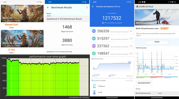 Avec une telle configuration, les performances sont au rendez-vous et les scores des outils de mesure le prouvent en affichant de très hauts scores. Par contre, malgré le fait qu’il y ait un système de refroidissement intégré, comme pour son prédécesseur, nous avons trouvé que le mobile chauffait lorsqu’il était soumis à rude épreuve ce qui n’est jamais très bon, car dans ce cas, les applications peuvent refuser de se lancer ou limiter la puissance maximale en vue de préserver les composants. Dans les jeux, la surchauffe se ressent moins. Voici les principaux résultats des mesures de performances brutes (à froid). Le processeur ne livre pas tout son potentiel, du moins après les 10 premières minutes de test, pour se caler aux alentours des 90% sur le temps restant.