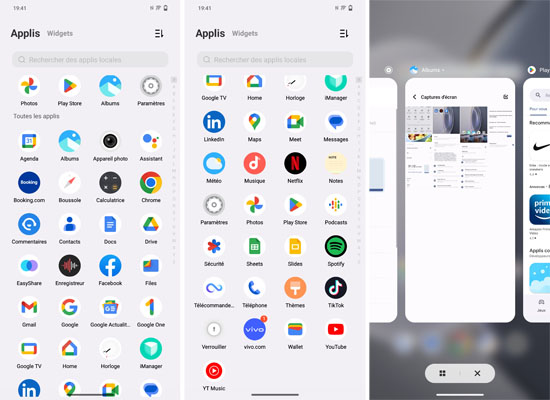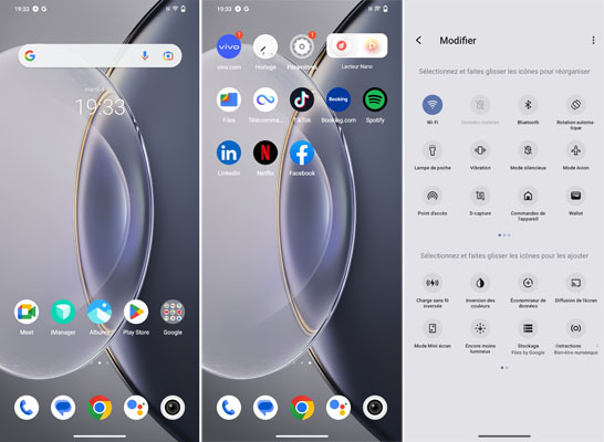 Le smartphone Vivo X90 Pro est animé par le système Android 13 avec une surcouche logicielle FuntouchOS 13. La mise à jour de sécurité ainsi que celle du Google Play dataient du 1er mars 2023 pour un test réalisé courant mars/avril ce qui est assez récent. Les options de personnalisation sont plutôt nombreuses sur cette interface. On a droit à la présence de deux écrans d’accueil principaux et les applications sont disponibles depuis le tiroir en partant du bas de l’écran avec une navigation par gestes. L’interface Google Discovery est disponible sur le côté gauche de la page principale et de très nombreuses fonctions raccourcies ainsi que les notifications sont disponibles en effectuant un balayage depuis le bord supérieur de l’écran. Les applications en cours d’exécution peuvent s’afficher à l’horizontale ou à la verticale avec un bouton virtuel toujours disponible pour toutes les fermer d’un seul coup. Un mode Ultra Jeu est disponible dans les paramètres pour configurer le mobile lors des sessions de jeu afin de ne pas être dérangé, le cas échéant ou appliquer différents effets sonores, mais également visuels avec des optimisations selon si on préfère la rapidité ou la qualité d’affichage. Vu que l’écran est grand, un mode une main est disponible.
