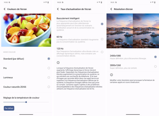 Un mode de protection des yeux est disponible ainsi que la possibilité de changer les couleurs de l’écran selon les modes Standard, professionnel, lumineux et jouer sur la température pour un rendu plus ou moins chaud. Un autre mode est proposé : Couleur naturelle Zeiss.
