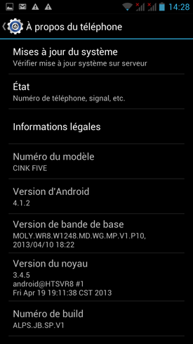 Une fois allumé, le Cink Five propose une interface Android Jelly Bean (ici en version 4.1.2) très peu customisée. Les habitués des Nexus ou des Alcatel verront quelques changements dans les icônes d'Android (celle du navigateur Web ou celle de la messagerie, par exemple). Mais cela s'avère extrêmement léger. Cela a un avantage et un inconvénient. D'une part, le système n'est pas freiné par une surcouche trop riche et trop profondément ancrée. Mais l'apport de Wiko est imperceptible. Cela ne dégrade pas l'expérience, fluide et dynamique. Mais cela manque d'un soupçon d'originalité. De même dans les applications pré-installées.