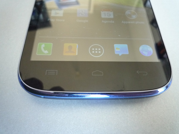 Sous l?écran, le pavé tactile très classique avec les trois raccourcis Android. Pour atteindre le port microSD et les deux ports SIM, il faut ouvrir le capot qui se déclipse facilement.