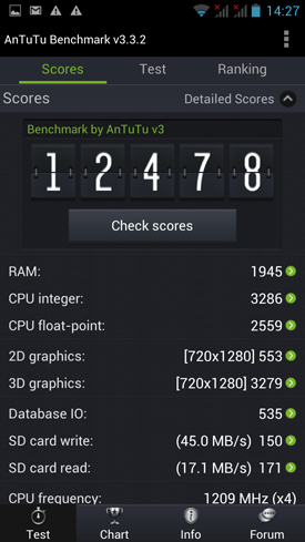 Nous avons soumis le Cink Five au benchmark AnTuTu afin d'évaluer la version commerciale de ce mobile. Il obtient 12478 points, un score honorable pour un smartphone de cette gamme, mais assez bas pour une plate-forme quad-core. Rappelons que chaque coeur de ce chipset MediaTek est cadencé à 1,2 GHz : ceci explique en partie cette note. Les performances brutes du mobile ne l'empêchent cependant pas d'offrir une bonne expérience globale. C'est dans certains usages multimédia que les limites du mobile se ressentent.