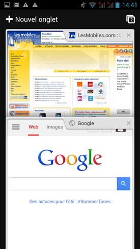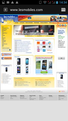 Pour la navigation Web, vous avez ainsi le choix avec Webkit et Chrome. Notre préférence va à Chrome, évidemment, dont les fonctions (synchronisation des onglets, mode "PC de bureau", etc.) sont plus riches. La navigation est toutefois assez similaire quel que soit votre choix, comme vous pouvez le constater avec les deux captures d?écran ci-dessous. Notez que le Cink Five est compatible HSPA 21 Mbit/s. Les téléchargements sont donc assez rapides.