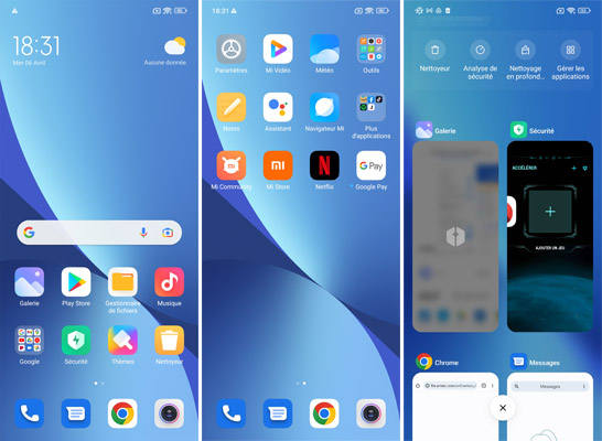 Le smartphone Xiaomi 12 est animé par le système Google Android 12 avec une surcouche logicielle MIUI 13 au moment de notre test. La mise à jour de sécurité date de début avril ce qui est très récent et permet ainsi d’être aussi protégé que possible, même si l’installation d’une solution complète contre les dangers d’Internet est toujours recommandée. Il est possible de naviguer avec des gestes à travers les menus et les applications. Le gestionnaire multitâches présente les applications alignées verticalement (dans le sens de la hauteur) plutôt qu’horizontalement sur tous les autres smartphones. C’est un peu déroutant au début si on avait l’habitude d’une présentation horizontale.