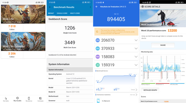 Ce processeur est également présent sur le OnePlus 10 Pro, le Oppo Find X5 Pro, le realme GT 2 Pro ou le Honor Magic4, par exemple. Avec une telle configuration, utiliser le Xiaomi 12 au quotidien est vraiment très agréable car le smartphone réagit avec une extrême vélocité quelles que soient les circonstances et le nombre d’applications installées ou en cours d’exécution. On a une réelle impression de fluidité notamment aussi servie par l’interface optimisée et développée par les équipes de Xiaomi. Aucun problème pour jouer aux jeux vidéo avec le Xiaomi 12 offrant la possibilité d’afficher les meilleurs graphismes tout en ne sacrifiant pas la jouabilité.