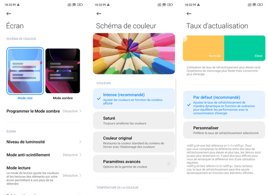 L’écran propose une définition de 1080x2400 pixels ce qui est standard mais il est compatible HDR10+ et Dolby Vision. Seul l’Asus Zenfone 8 peut proposer une équivalence mais seulement pour le HDR10+, vu qu’il ne supporte pas le format Dolby Vision notamment utilisé par la plateforme Netflix ou Apple TV+, par exemple. En outre, il profite également d’une fréquence de rafraîchissement de 120 Hz ce qui est aussi le cas du Zenfone 8 mais aussi des autres modèles haut de gamme comme le OnePlus 10 Pro, le Oppo Find X5 ou Samsung Galaxy S22, par exemple. Notez également le taux de rafraîchissement de 480 Hz ce qui lui permet d’être très réactif dans les jeux vidéo notamment. La luminosité offerte par l’écran du Xiaomi 12 est tout à fait satisfaisante avec une possibilité d’usage en extérieur, sans trop de gêne. Concernant les paramètres de l’écran, il est possible d’activer un mode anti-scintillement ainsi que le mode lecture. On peut choisir parmi plusieurs schémas de couleur : intense, saturé, couleur original et paramètres avancés avec, dans ce cas, la possibilité de choisir les gammes de couleur entre original, P3 ou sRGB, correspondant à des espaces colorimétriques standardisés. On peut jouer avec la teinte, la saturation ou encore le contraste. Pour la fréquence de rafraîchissement, on peut choisir le mode dynamique ce qui est, selon nous le plus pertinent étant donné que dans ce cas, c’est le smartphone qui choisit automatiquement la meilleure fréquence selon l’application utilisée. On sait qu’une fréquence de 120 Hz consomme plus que du 60 Hz… Toutefois, il est également possible de bloquer la fréquence sur 60 ou 120 Hz pour différentes raisons. Enfin notez que le Xiaomi 12 profite de plusieurs moteurs d’amélioration des contenus multimédia notamment en utilisant de l’intelligence artificielle pour optimiser le rendu, gérer une Super résolution et rendre le mieux possible les contenus HDR. La fonction d’optimisation des vidéos MEMC est également de la partie. L’écran est protégé par la technologie Corning Gorilla Victus, soit le niveau de protection le plus élevé aujourd’hui. Il y a un film protecteur plaqué dessus. Xiaomi propose le remplacement gratuit jusqu’à 6 mois après la date d’achat.