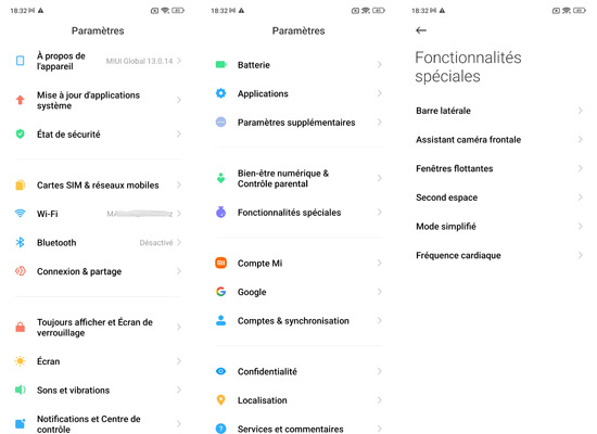 Plusieurs fonctions y sont présentes, bien plus que sur les autres surcouches avec notamment la possibilité d’activer des fenêtres flottantes, des outils de nettoyage en surface ou en profondeur du système, lancer une analyse de sécurité ou enfin d’accéder aux paramètres pour y gérer les applications. Un moteur de recherche est également présent scrutant les applications, les documents enregistrés, les contacts, etc. Comme sur les autres mobiles de la marque, en faisant glisser le doigt depuis le côté gauche du poinçon du capteur photo frontal, on tire les notifications et en réalisant le même geste depuis le côté droit, on fait apparaître les raccourcis ainsi que l’outil de gestion de la luminosité de l’écran. Parmi les fonctions spéciales, outre la barre latérale et les fenêtres flottantes, il est également possible de profiter d’un second espace sécurisé pour mettre à l’abri des regards indiscrets certaines applications ou documents. Nous avons aussi évoqué la fonction de mesure cardiaque réalisable depuis le lecteur d’empreinte digitale.