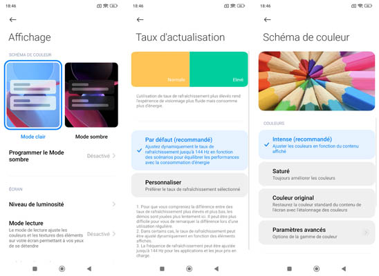 Il y a 3 schémas de couleurs : Intense, Saturé, Couleurs originales et un menu Paramètres avancés permet de choisir la gamme de couleurs utilisée entre Original, P3 ou sRGB. Notez la possibilité d’activer une fonction qui adapte les couleurs, selon l’éclairage ambiant. Grâce à son processeur, l’appareil peut optimiser le rendu des images et des vidéos grâce à de l’intelligence artificielle.
