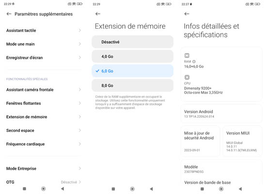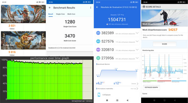Le Xiaomi 13T Pro est animé par la puce MediaTek Dimensity 9200+ avec, pour notre modèle de test, une capacité en mémoire vive de 16 Go. Comme sur la plupart des mobiles récents, on peut ajouter 4, 6 ou 8 Go de mémoire vive virtuelle supplémentaires, le cas échéant. L’option est proposée dans un menu qui, selon nous, n’est pas le mieux choisi, car disponible au sein de la fonction Paramètres supplémentaires. Avec une telle configuration, le smartphone réagit extrêmement rapidement. Les applications se lancent avec une vélocité déconcertante et on passe de l’une à l’autre en un rien de temps. Les animations sont exécutées avec une extrême rapidité. Lors de notre phase de test, nous n’avons constaté aucun ralentissement. Le mobile s’est montré toujours réactif et prêt à répondre à la moindre de nos sollicitations.