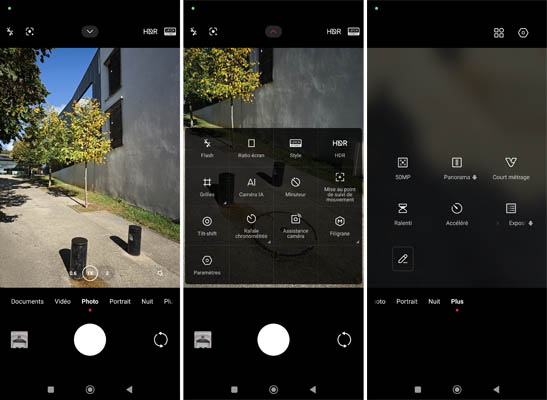 L’interface de l’application Appareil photo est classique. On a droit à des options disponibles en haut de l’écran notamment avec la possibilité d’activer le mode HDR, l’intelligence artificielle et les deux modes Leica. L’option Google Lens est aussi proposée en haut de l’interface. En dessous, il y a la zone de cadrage avec des niveaux de zoom immédiatement accessibles : 0,6x, 1x, 2x. Pour aller plus loin, il suffit de faire un mouvement d’écartement des doigts et une molette virtuelle apparait en bas de la zone de cadrage. Plusieurs modes de prise de vue sont disponibles : Pro, Documents, Vidéo, Photo, Portrait, Nuit et Plus. Dans ce dernier menu, il y a d’autres modes : 50MP, Panorama, Court métrage, Ralenti, Accéléré, et Exposition longue. C’est un peu moins fourni que le Xiaomi 13 Ultra, pensé pour les photos.
