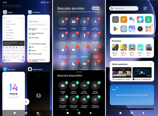 La navigation par gestes à travers les menus et les applications est possible. Lors de la configuration, on peut choisir le lanceur pour proposer une interface qui réunit toutes les applications dans un tiroir virtuel ou les présente sur les pages d’accueil. Le gestionnaire multitâches présente les applications alignées verticalement (dans le sens de la hauteur) plutôt qu’horizontalement sur tous les autres smartphones. On apprécie le fait d’avoir plusieurs fonctions qui y sont présentes, bien plus que sur les autres surcouches. Il est ainsi possible d’activer des fenêtres flottantes, des outils de nettoyage en surface ou en profondeur du système, lancer une analyse de sécurité ou enfin d’accéder aux paramètres pour y gérer les applications. Un moteur de recherche est également présent permettant d’analyser les applications, les documents enregistrés, les contacts, etc.