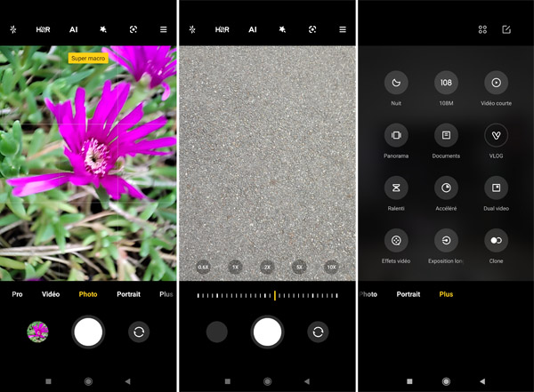 On peut directement choisir entre les modes Pro, Vidéo, Photo, Portrait et Plus. Ce dernier donne accès à d'autres modes et il est possible de personnaliser l'interface pour ajouter des modes au départ inclus dans « Plus » parmi : Nuit, 108M, vidéo courte, Panorama, Documents, Vlog, Ralenti, Accéléré, Dual vidéo, Effets vidéo, Exposition longue et Clone. Le choix est ici particulièrement large ce qui est appréciable. Notez que l'on peut également choisir une couleur dominante et configurer l'application afin que le menu Plus soit affiché comme un tiroir de modes et non plus comme un onglet, pour un accès plus rapide.