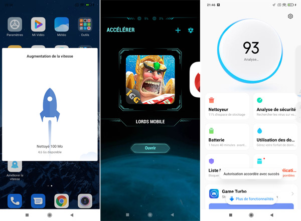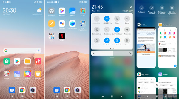 Toutes les applications s'installent sur l?écran d'accueil et le gestionnaire de tâches permet d'accéder à plusieurs fonctions pertinentes comme le nettoyeur, l'analyse de sécurité, par exemple. Le système est navigable par gestes.