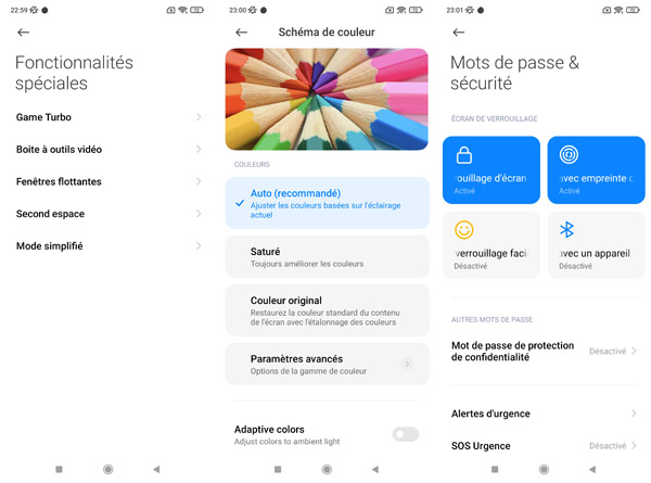 L?écran est agréable à regarder. Il est tout à fait opérationnel en intérieur, mais aussi en extérieur, même en plein soleil. Comme sur le Poco F3, plusieurs schémas de couleurs peuvent être choisis : automatique, saturé, couleur originale et avancé. En entrant dans ce menu, on peut régler beaucoup plus de détails. Il suffit de sélectionner l'une des gammes de couleurs proposées parmi amélioré, original, P3, sRGB et de jouer sur la teinte, la saturation, la valeur, le contraste. La fréquence de rafraîchissement peut être réglée sur 60 ou 120 Hz, mais on regrette de ne pas trouver de système automatique afin que ce soit le mobile qui gère le taux pour permettre une meilleure autonomie. En effet, en laissant le mode 120 Hz, la batterie va se décharger plus rapidement qu'en 60 Hz. Trois fonctions permettent d'optimiser la lecture de médias : le mode Super Résolution qui va augmenter la définition de la source, l'amélioration HDR pour apporter plus de détails dans les zones sombres pour des contenus non HDR et le MEMC qui permet de fluidifier les images à l?écran.