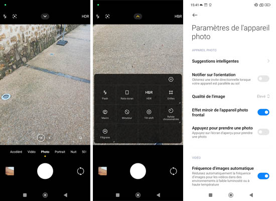L’interface de l’application Appareil photo est très classique. Les principaux paramètres sont affichés en haut de l’écran avec la possibilité de lancer l’application Google Lens pour la reconnaissance des objets. En dessous, il y a la zone de cadrage puis les niveaux de zoom 1x et 2x puis les différents modes de prises de vue. De gauche à droite, il y a les modes Accéléré, Vidéo, Photo, Portrait, Nuit et 50MP. Il n’y a pas d’autres modes. Le mode macro est proposé au sein des paramètres.