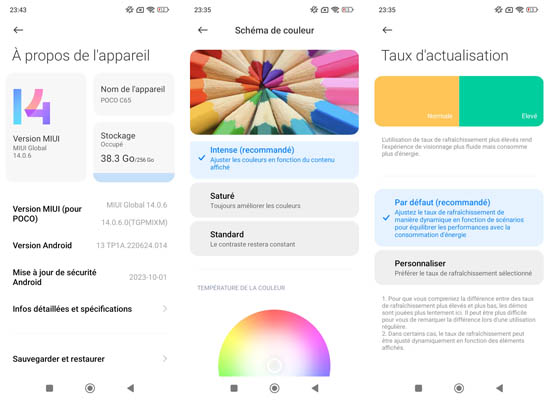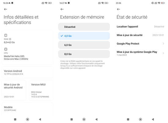 Le POCO C65 est animé par Android 13 avec une surcouche logicielle MIUI 14.0.6 au moment de notre test. La mise à jour de sécurité datait du 1er novembre 2023 pour un test réalisé début décembre, ce qui est récent et donc satisfaisant. Ce qui l’est moins, c’est la date de mise à jour de Google Play puisqu’elle est du 1er mai 2023, donc pas vraiment récente.