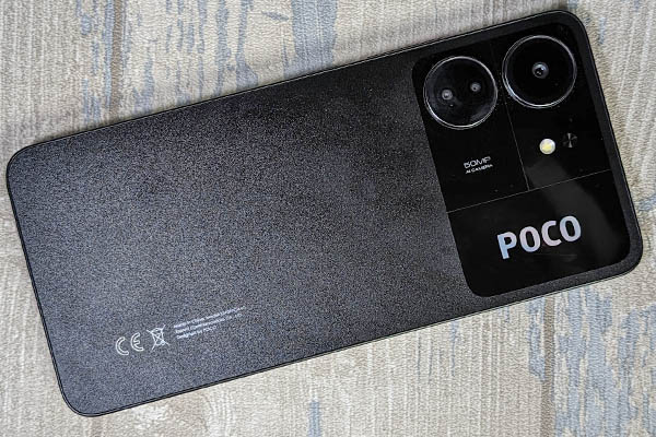 Le smartphone POCO C65 propose un format plutôt conventionnel des dimensions plutôt généreuses. Il fait 168 mm de haut pour 78 mm de large, ce qui le place parmi les plus volumineux du marché, même face à la concurrence. Celle-ci est symbolisée par les Samsung Galaxy A14 4G, Xiaomi 13C, Honor X7a et Nokia g14, par exemple. Le mobile propose des profils relativement plats et il offre une excellente prise en main avec un dos totalement plat. Le châssis est en plastique, comme l’arrière du smartphone. Au dos, il y a un revêtement anti-traces de doigts à peine efficace. Il est proposé en noir (version testée), bleu ou violet. La finition noire est légèrement brillante.