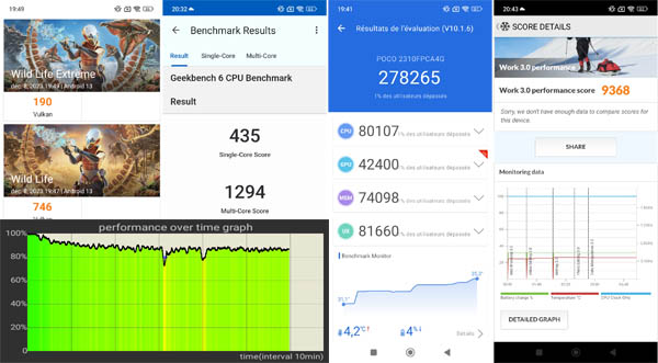 Après examen des résultats de l’application CPU Throttling, on constate que le chipset livre tout son potentiel pendant toute la durée du test, ce qui est une très bonne chose et pas forcément le cas de tous les Soc. À l’usage et soumis à rude épreuve, la température de l’appareil reste tout à fait acceptable. Comme pour les autres smartphones, nous avons soumis le POCO C65 à des outils de mesure de performances brutes afin de le comparer aux autres téléphones du marché et dont voici les principaux résultats.
