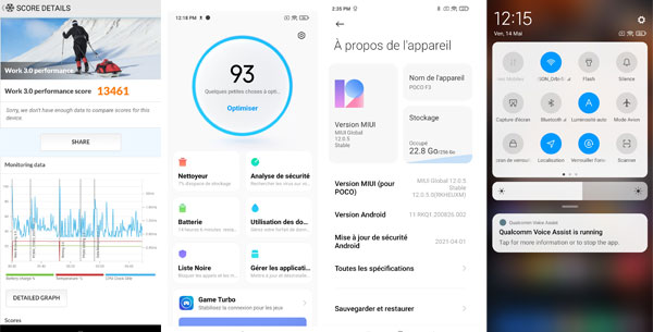 Le Poco F3 est animé par le système de Google, Android 11 avec une surcouche logicielle MIUI 12 commune à tous les smartphones Xiaomi. Elle est proposée en version 12.0.5 au moment de notre test. Agréable à l??il, elle est fluide et permet un très haut niveau de personnalisation. Les paramètres sont très nombreux, presque trop, mais cela a au moins le mérite de pouvoir configurer le mobile selon ses propres besoins. À l'image de ce que l'on peut faire sur le Mi 11, par exemple, le gestionnaire des applications en cours d'exécution permet d'accéder à quelques fonctions pratiques comme le nettoyeur, l'analyse de sécurité, le nettoyage en profondeur ou la gestion des programmes installés. La navigation par gestes est possible. L'application de thèmes l'est également et de nombreux raccourcis sont disponibles au niveau de la barre des notifications.