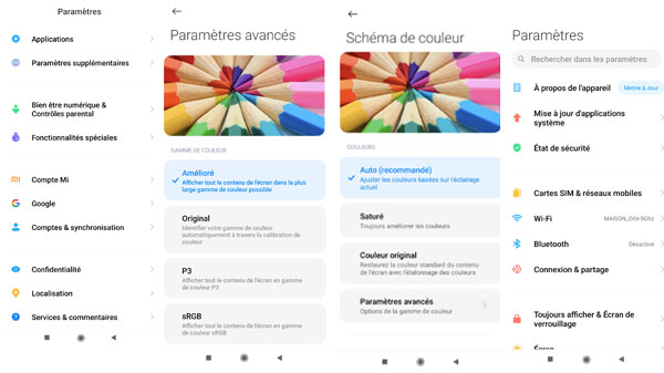 Attention toutefois, le mode n'est pas adaptatif ce qui signifie qu'il passe de 60 à 120 Hz, mais ne s'adapte pas selon les applications en cours d'exécution. Une fonction réservée (pour le moment aux seuls haut de gamme). Comme sur le Xiaomi Mi 11 avec lequel il partage l'interface, les paramètres de réglage de l?écran sont assez nombreux et permettent de l'ajuster au mieux, selon vos besoins et votre niveau d'exigence. Toutefois, sachez que dans sa configuration d'origine, il propose une bonne qualité. Malgré cela, plusieurs schémas de couleurs sont disponibles : automatique, saturé, couleur originale, couleurs adaptatives et avec la possibilité de sélectionner des gammes de couleurs : DCI-P3, sRGB, amélioré ainsi que sur la teinte, la saturation, le contraste ou le gamma. Un mode Lecture pour limiter la fatigue oculaire est également disponible. Enfin, notez la possibilité d'optimiser le rendu des vidéos avec la technologie MEMC et d'amélioration par intelligence artificielle avec effet HDR.