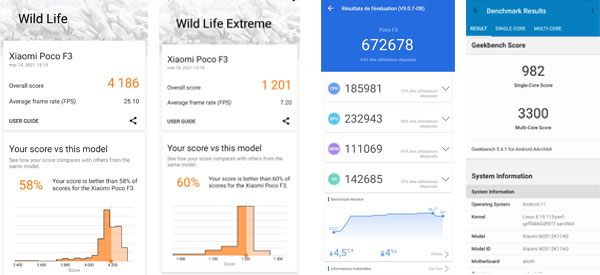 Comme les autres appareils, nous avons soumis le Poco F3 à plusieurs outils de mesures de performances brutes afin de comparer les résultats dont voici les principaux.