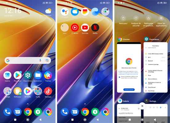 Balayez l?écran depuis le côté gauche du poinçon du capteur photo frontal permet d'accéder aux notifications tandis qu'un balayage du côté droit déroule les principaux raccourcis des fonctions et la possibilité de gérer le niveau de luminosité. Le gestionnaire multitâches est le plus complet du plateau offrant non seulement la possibilité de retrouver des applications ouvertes précédemment, mais également d'accéder à des fonctionnalités telles que le nettoyage, l'analyse de sécurité, le nettoyage en profondeur. Les applications y sont présentées en mode vertical et non pas à l?horizontale comme c'est le cas sur les autres mobiles sous Android et iOS. Bien entendu, l'interface est personnalisable avec différents thèmes et des fonds d?écran divers et variés. La mise en page peut également suivre différents schémas. Les options de bien-être numérique et de contrôle parental sont présentes comme les fonctions spéciales à l'image de la barre latérale se déployant pour permettre d'accéder à des applications préférées ou à certaines options, les fenêtres flottantes et le second espace qui sert à mettre à l'abri des regards certaines applications. Lors de nos tests, nous avons trouvé l'interface fluide même si nous devons reconnaître qu'un nombre limité d'applications étaient installées dessus. À ce sujet, le Poco F4 GT en propose plusieurs préinstallées dont Agoda, Boutique Amazon, Facebook, Genshin Impact, Joom, Netflix, ShareMe, Spotify, Télécommande, TikTok et YouTube Music. Poco est encore l'une des rares marques à proposer autant d'applications préinstallées. D'ailleurs, il est assez agaçant de voir des publicités apparaître à la suite de l'installation d'une application, par exemple, juste avant son lancement ou à d'autres occasions. Heureusement, en allant dans les paramètres et en désactivant certaines options de confidentialité, on peut s'en débarrasser.