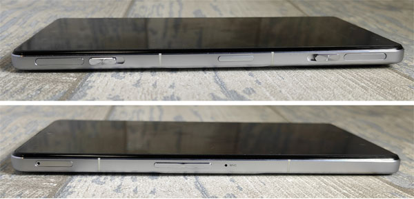 Si on fait le tour du téléphone, on peut apprécier les profils métalliques. On remarque la position centrale dans le sens de la hauteur pour le bouton de mise en veille, sur le profil droit. C'est aussi là que sont installées les deux boutons gâchettes de l'appareil. On peut les « libérer » en utilisant les deux boutons-poussoirs placés juste à côté. Notez la possibilité de les personnaliser pour qu'il déclenche certaines actions comme la prise de photos, par exemple. Sur le profil supérieur, il y a un haut-parleur avec un effet de style, un émetteur infrarouge pour transformer le mobile en une télécommande universelle et un microphone. Sur le profil gauche, il y a le tiroir à carte SIM. Notez la possibilité d'en insérer deux simultanément, mais impossible d'inclure une carte mémoire pour étendre la capacité de stockage interne de l'appareil. Un peu plus bas, il y a le double bouton pour gérer le volume et un deuxième microphone. Enfin, sur le profil inférieur, il y a le deuxième haut-parleur, encore, un microphone et le connecteur USB-C.