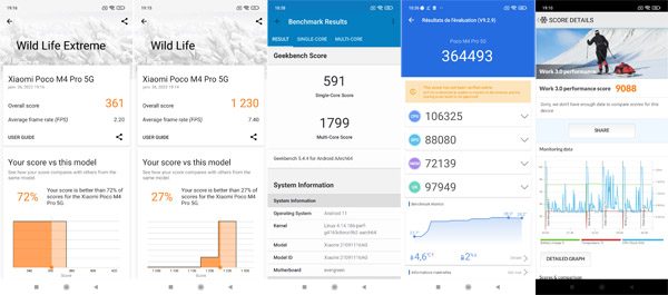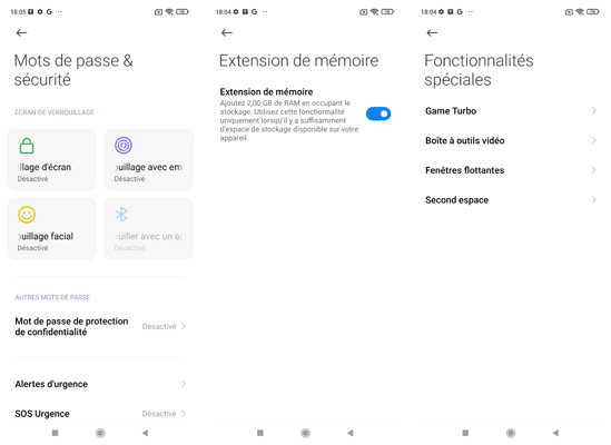Pour fonctionner, le POCO M4 Pro embarque une puce MediaTek Dimensity 810 associée à 4 ou 6 de mémoire vive et 64 ou 128 Go d'espace de stockage interne extensibles grâce à une carte mémoire. Nous avons testé la version 6+128 Go et l'avons soumis à plusieurs outils de mesure de performances brutes. Dans les paramètres, il est possible d'activer la fonction d'extension de la mémoire vive. Chez realme, cette option se trouve dans les paramètres système de l'appareil alors qu'ici, il faut ouvrir le menu Paramètres supplémentaires puis la fonction Extension de mémoire. 2 Go peuvent ainsi être récupérés de la mémoire de stockage.