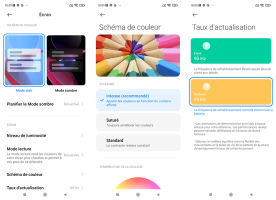 Dans les paramètres, il y a un mode lecture pour limiter la fatigue oculaire et on peut choisir entre plusieurs schémas de couleur entre Intense, Saturé ou Standard (ce dernier offrant le meilleur rendu). Il est également possible de modifier la température de la couleur pour avoir une teinte plus chaude ou plus froide. La fréquence de rafraîchissement peut être bloquée sur 60 ou 90 Hz selon les besoins, mais il n'y a pas de mode automatique qui permettrait d'optimiser la consommation d?énergie. La luminosité offerte par la dalle installée sur le POCO M4 Pro est tout juste suffisante pour un usage en extérieur en plein soleil. L'ombre est conseillée.
