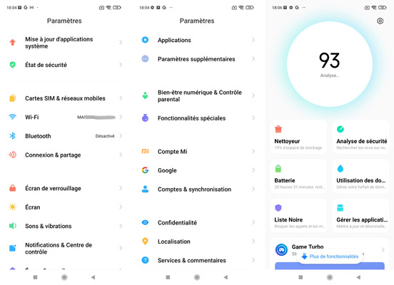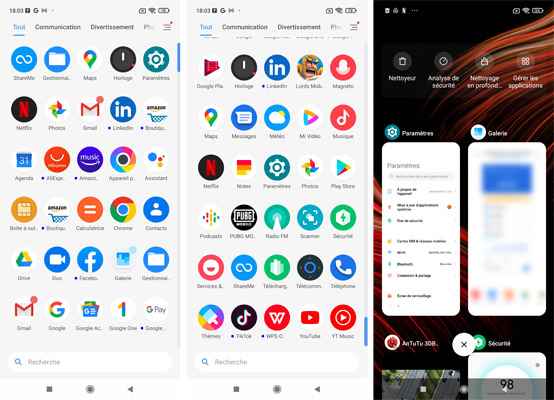 On a ainsi droit à AliExpress, Amazon Music, Boutique Amazon, LinkedIn, Lords Mobile : Tower Defense, Netflix, PUBG Mobile, Share Me, Télécommande (pour utiliser l?émetteur infrarouge), TikTok et WPS Office (suite bureautique). Ajoutez à cela les applications Google. Certains apprécieront de déjà trouver des applications qu'ils utilisent, mais d'autres préfèrent un environnement plus épuré. Avec MIUI, il est possible d'utiliser les gestes pour naviguer dans les menus, revenir à l'accueil et ouvrir la page des applications en cours d'utilisation. Sur cette page, comme sur les mobiles Xiaomi, l'interface propose de nombreuses fonctionnalités : Nettoyeur, analyse de sécurité, nettoyage en profondeur et gérer les applications avec un affichage en hauteur alors que la plupart des pages proposent habituellement une organisation dans le sens de la largeur. Un bouton virtuel permet de fermer instantanément toutes les applications ouvertes. En faisant un geste depuis le haut de l?écran, du côté gauche du poinçon, on tire les notifications et en réalisant le même geste depuis le côté droit du poinçon, on tire les fonctions raccourcies. Ceux-ci sont personnalisables afin d'afficher celles qui sont le plus souvent utilisées. Les paramètres sont nombreux et assez bien organisés et les options de personnalisation de l'interface sont au complet. Notez la possibilité d'activer le mode Game Turbo, des fenêtres flottantes et un espace sécurisé.
