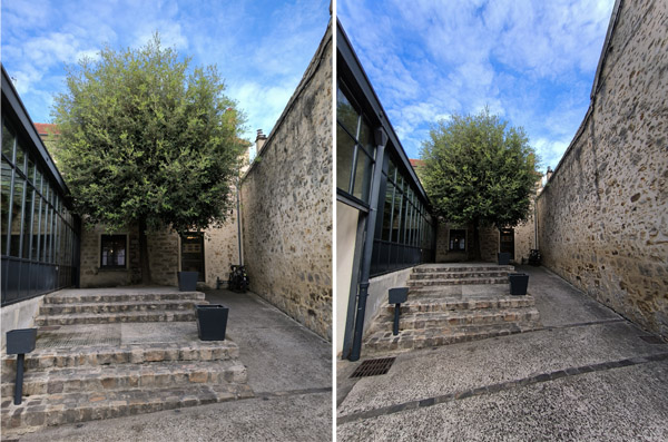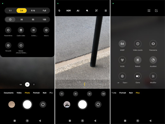 L’application Appareil photo propose plusieurs modes accessibles depuis l’icône représentant trois petits traits en haut de l’écran (Macro, Tile-shift et rafale chronométrée) alors qu’on aurait préféré qu’ils soient tous regroupés au même endroit, au-dessus du bouton virtuel de déclenchement, voire dans le menu Plus. Les modes immédiatement accessibles sont, de gauche à droite : Pro, Documents, Vidéo, Photo, Portrait, Nuit et Plus. Dans ce dernier, on trouve les modes 64MP, Vidéo courte, Panorama, Vlog, Ralenti, Accéléré, Exposition longue et Clone. On peut ajouter l’un de ces modes aux autres pour une interface personnalisée. Les niveaux de zoom ultra grand-angle, 1x et 2x sont immédiatement accessibles aidant à l’ergonomie lors de la réalisation des photos. La réglette qui permet de zoomer est assez précise pour ne pas perdre le niveau lorsqu’on relâche le doigt.